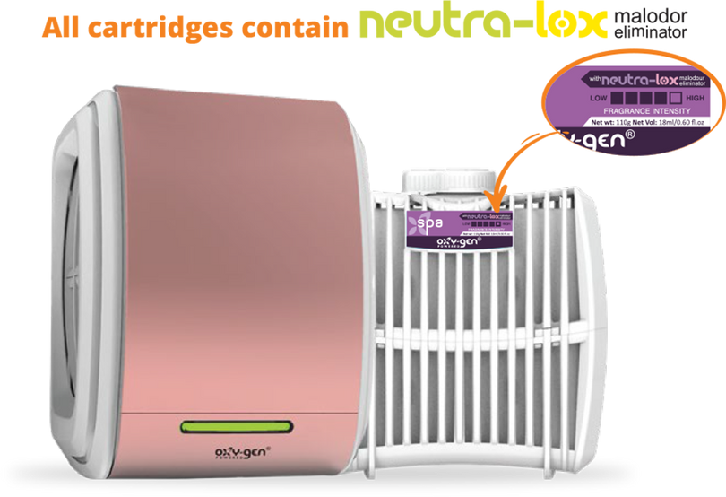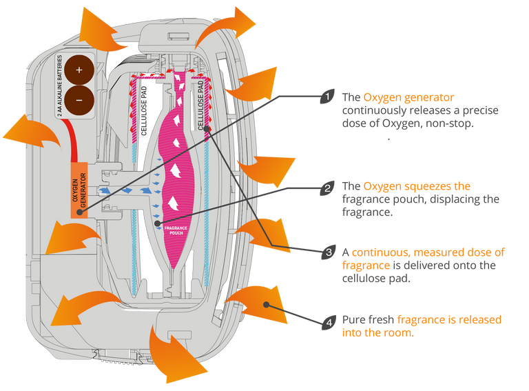 Oxy-Gen Powered is the only technology that guarantees the delivery of fragrance in the air continuously, consistently and accurately for the entire duration of the cartridge life. This precise technology is based on a fuel cell technology that is used in the pharmaceutical industry to deliver drugs to human beings and animals. Oxy-Gen Powered technology is simple, reliable and cost-effective.
